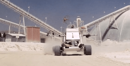 007 flees into a different part of the compound where a moon landing is being faked. When he’s spotted, he runs across the moon set. One of the “astronauts” tries to grab our hero but is too committed to moving in slow-motion to be a danger. Bond jumps into a moon rover and drives his way through a wall to get to the desert outside. Security guards give chase with cars and ATVs in a fairly ridiculous sequence where, frankly, you never get the feeling of Bond being in any danger.